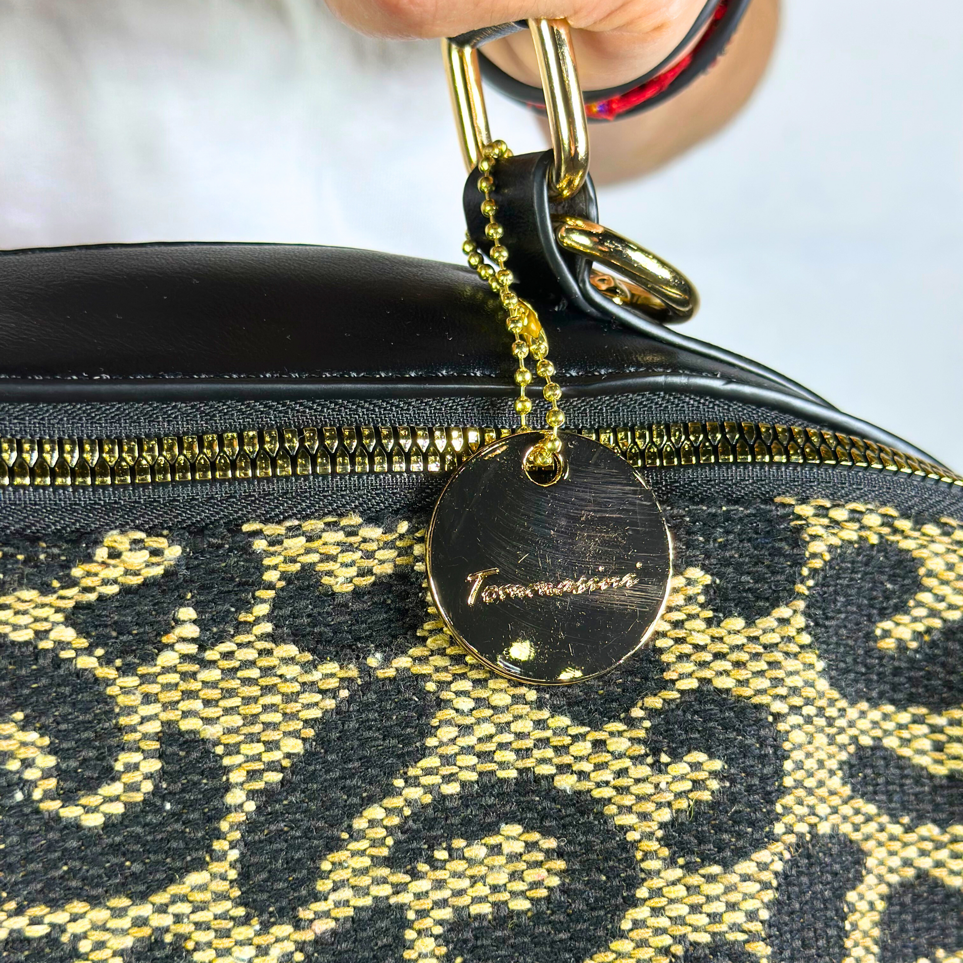 Grande borsa animalier con manico + tracolla neri e fibbie in metallo dorato.