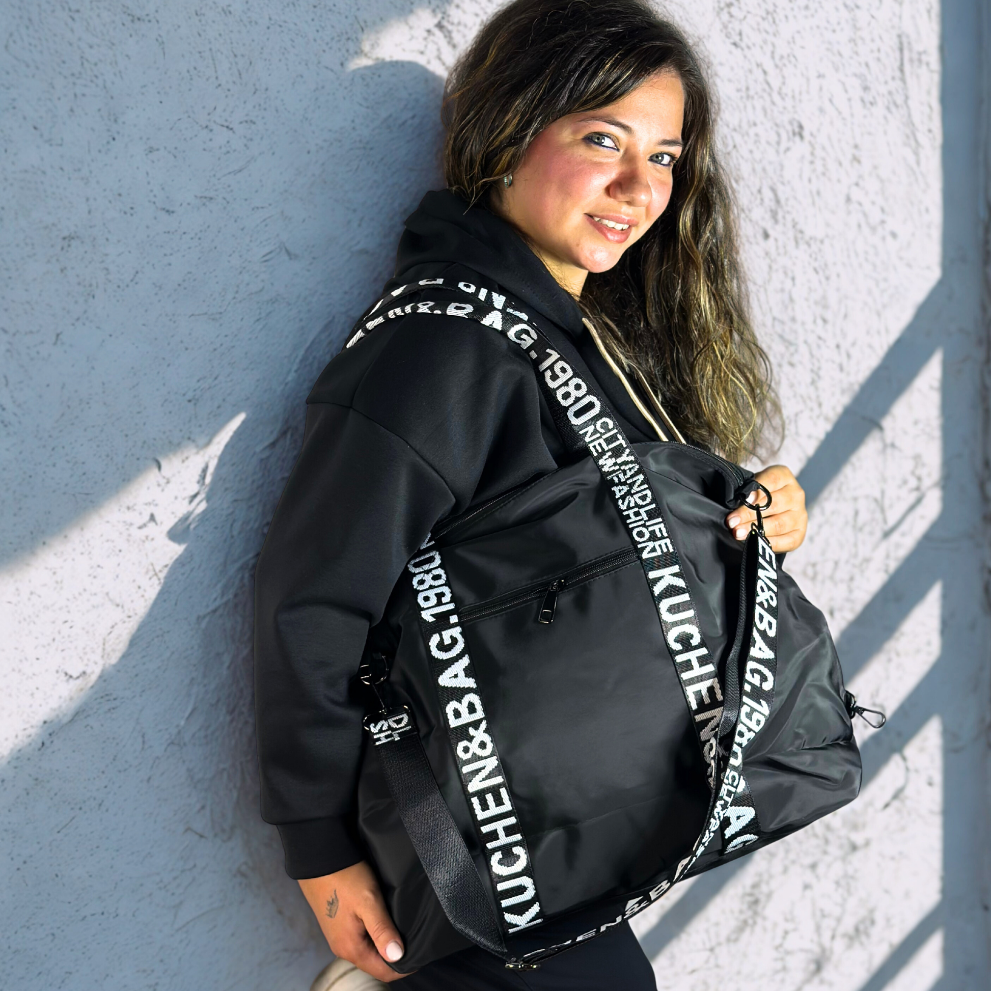Grande borsa impermeabile bianca e nera piena di scomparti con scritte applicate su bretelle cucite a contrasto in tessuto.